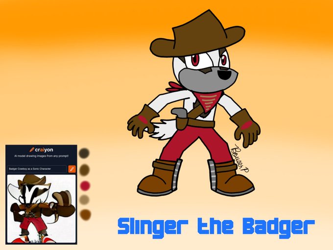#Inktober2022 "AI Sonic OCs Edition" Day 14 I like the concept of Cowboy Sonic characters and I thought a badger would be a cool one. This is Slinger the Badger. Enjoy