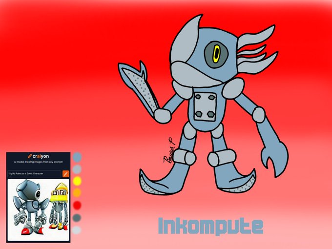 #Inktober2022 "AI Sonic OCs Edition" Day 22 I wondered what a squid robot would give me, and it gave me a very cute design, so I went with it. This is Inkompute. I'm sure he's trying his best.
