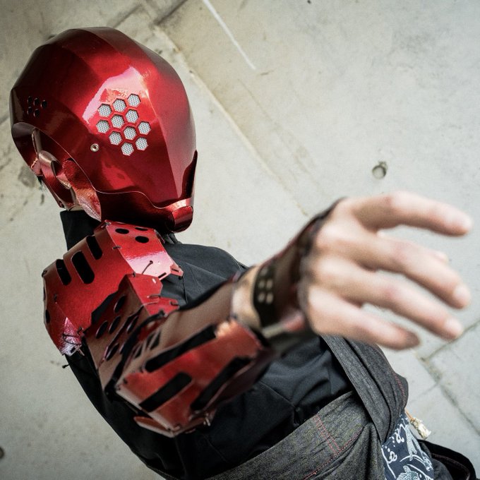 土曜日に入間市のコスプレ・イベント『入間の乱』で撮影してもらったベストショット。 赤い装備はペーパークラフトにスプレー塗装した物です。 Special thanks! Camera: @unmatchsan #入間の乱 #サイバーパンク #ペーパークラフト #cyberpunk #papercraft #cyberpunk武侠 #メカヘッド