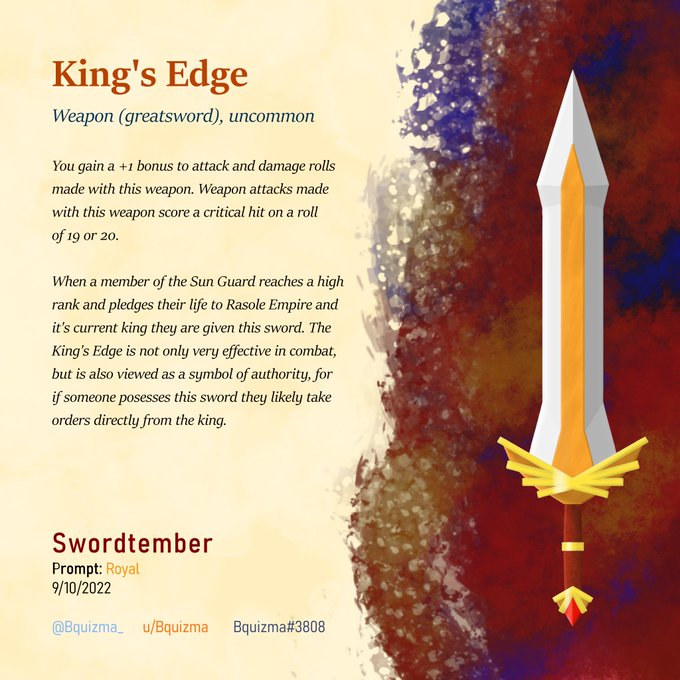 My second entry to #swordtember again with some 5e stats (and some background lore). Prompt: Royal Thanks to @randomspirits for the prompts #swordtember2022 #DnD #dndart #digitalart