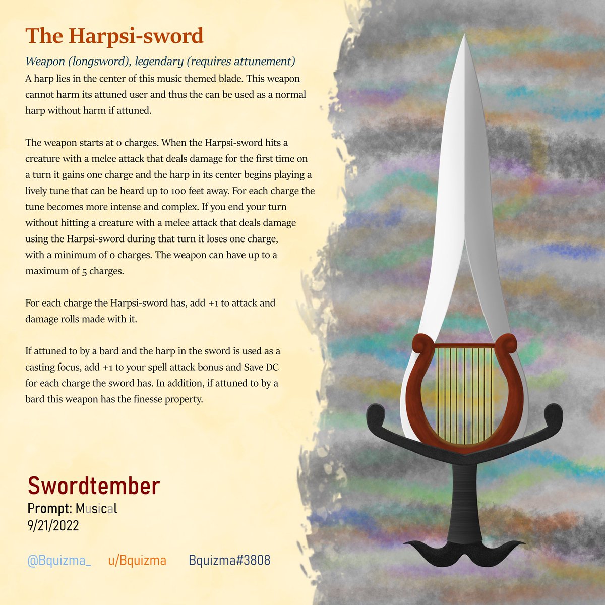 For my next #swordtember sword: the Harpsi-sword (get the pun?). A weapon prized by both bards and warriors alike. This is probably my favorite mechanically so far. Thanks to @randomspirits for the prompts. #swordtember2022 #dnd #dndart