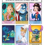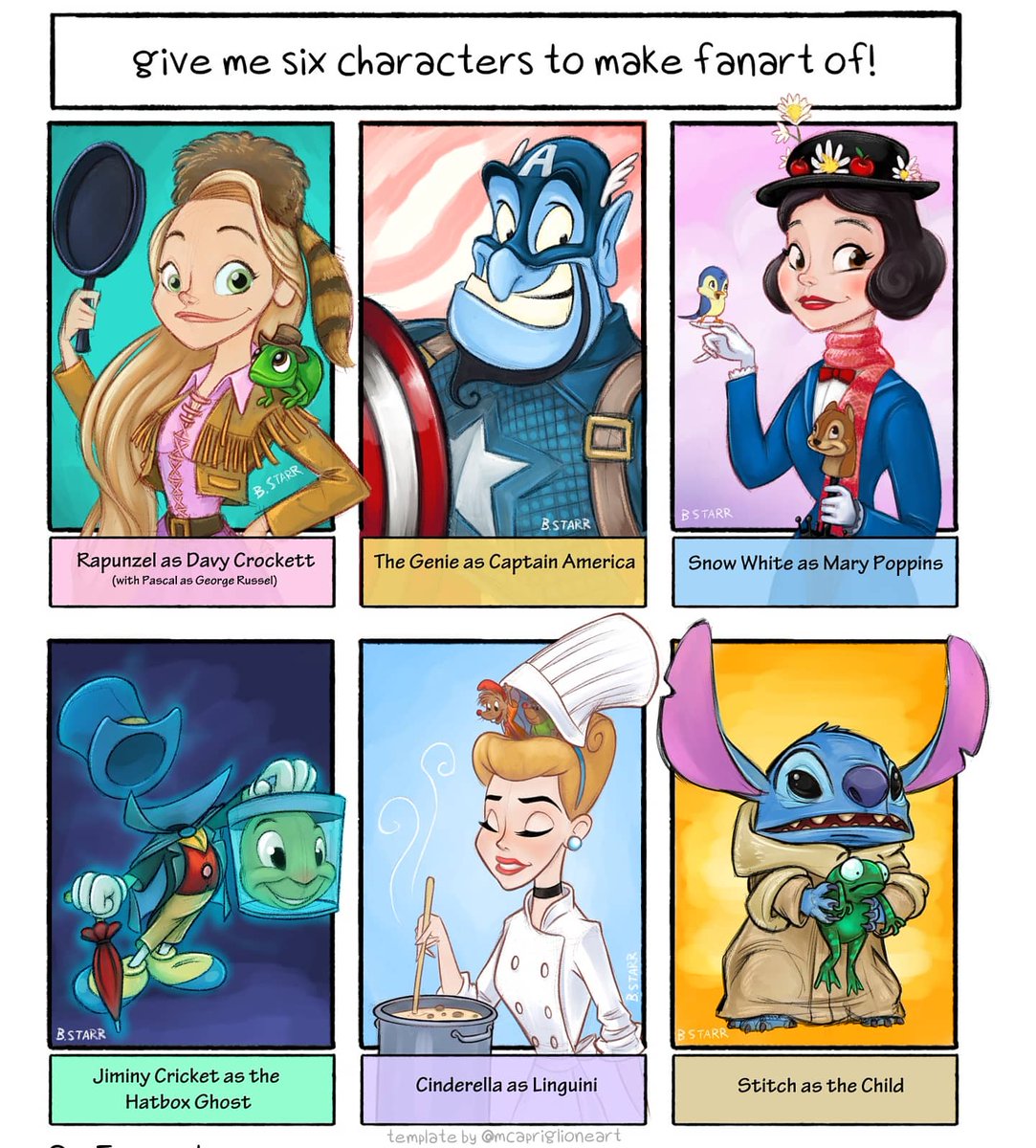 Here together are all six of my #sixfanarts Anyone have a favorite? #sixfanartschallenge #disneyfanart #illustration #cartoon #fanart #mashups #disney #pixar #marvel #tangled #alladin #snowwhite #pinocchio #cinderella #liloandstitch