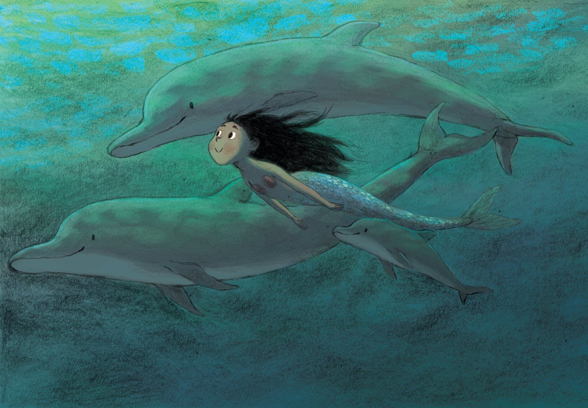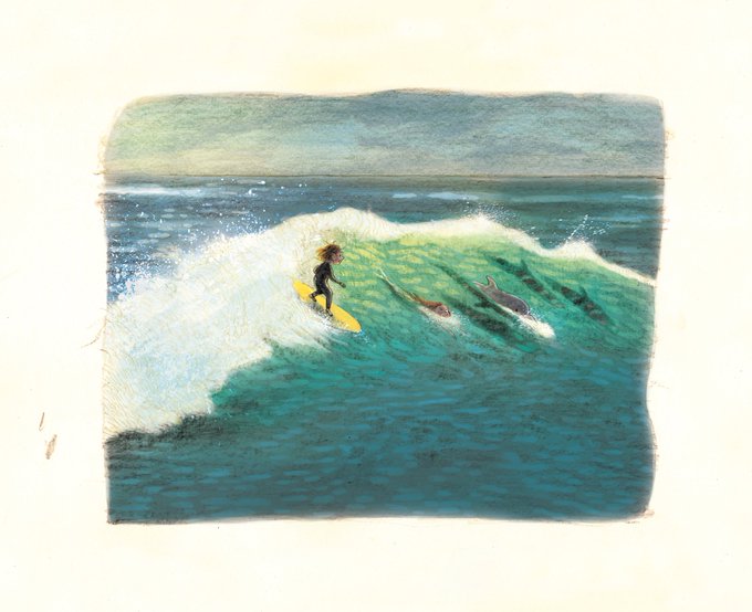 Another concept art for the ‘The Mermaid Moon’ for #mermay #mermay2022 Publishing in October with the lovely @anneschwartzbooks @randomhousekids ! Molly and Merrin go surfing with dolphins 🪸🧜🏼♀️🐚🦀🐬