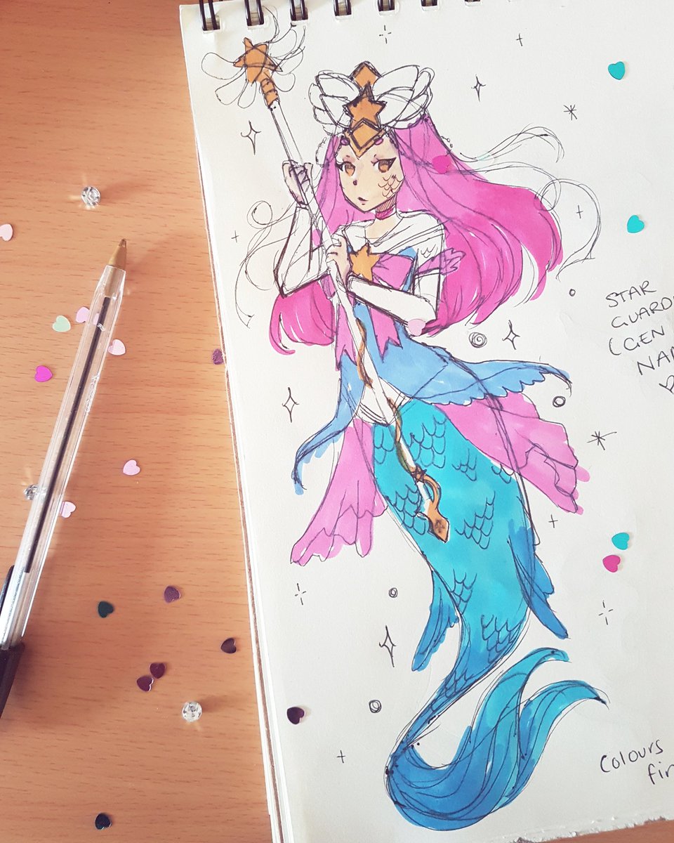 Old concept of first gen. Star Guardian Nami from my sketchbook a while ago. Needs a few re thinks but she has pink hair so it's OK. #Cute #mermay #mermaid #artoflegends #sketchbook #nami