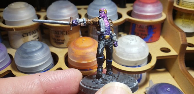 #inktober2021 Day 9. Domino. I painted her based off the Jim Lee design, did black mixed with a touch of blue for the leather costume, then touched up with blue highlights. Kinda wished I had used green stuff to make prominent shoulder pads, but settled for just the purple there.