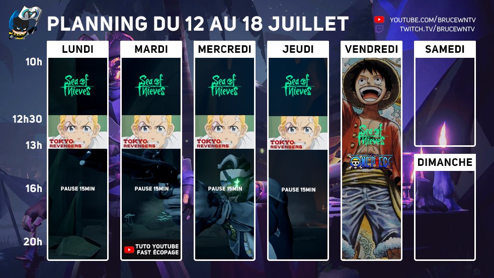 Planning du 12 au 18 Juillet Crossover #OnePiece x #SeaOfThieves ➡️twitch.tv/brucewntv⬅️ ➡️youtube.com/brucewntv⬅️ #Cosplay #MonkeyDLuffy #twitch #twitchfr #twitchaffliate