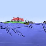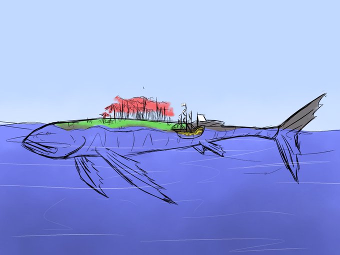 Drawing of a big Island Fish Probably one of the largest fish species in my magic spec evo world and is priced for having a fungal forrest (that comes in varying colours) and ores used to power weapons and/or machinery #worldbuilding #ArtistOnTwitter #digitalart #creaturedesign