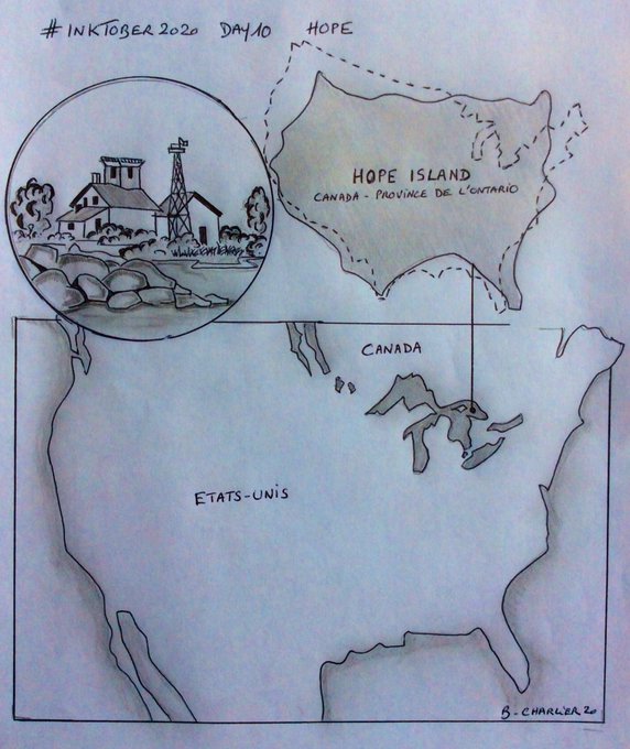 #inktober2020 #inktoberday10 #HOPE 🤔 😕 j'ai trouvé l'île Hope, inhabitée, située dans la baie Géorgienne du lac Huron (Canada - Province de l'Ontario), avec son phare et surtout sa forme... quasiment celle des Etats-Unis.