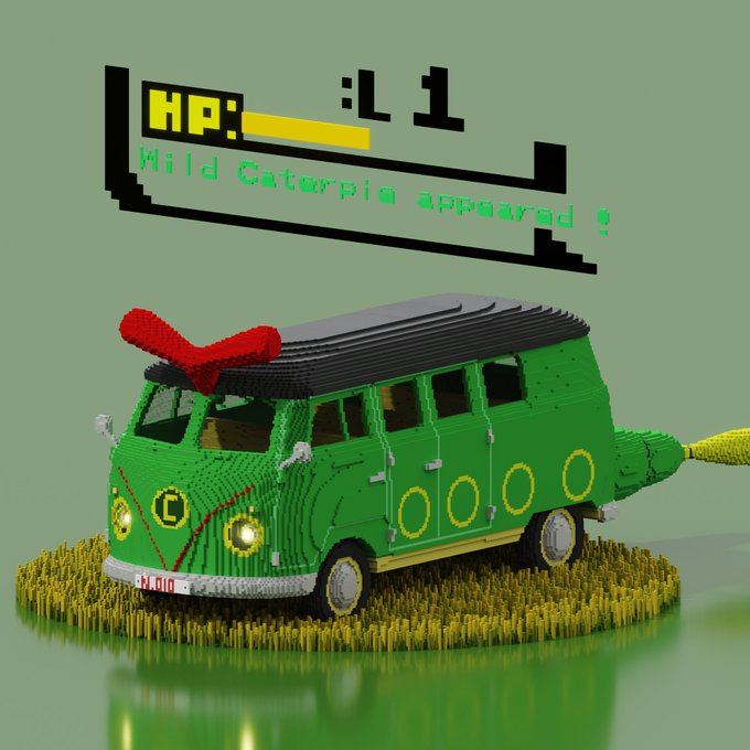 PokeCar #10 (caterpie) In the 60s hippies traveled the world in this van, yes of course they also took dr*gs! opensea.io/collection/pok… New collection #nftdrop #nftcollector #nftcollection #nftshill #metaverse #voxelart #opensea #anime #caterpie #pokemon #metapod