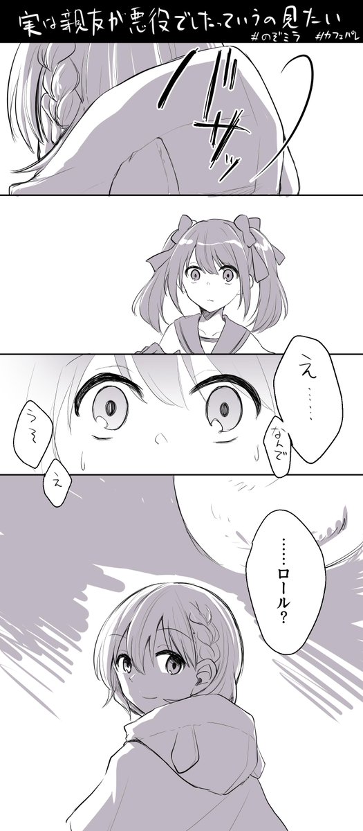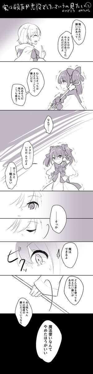 主人公の親友が敵でしたってお話が大好きなのでカフェパレのぞミラで咲ちゃん主人公親友の巻緒が実は悪の魔法使いでしたって対立する展開がメチャクチャ見たいのでよろしくお願いします #パッションMini作戦