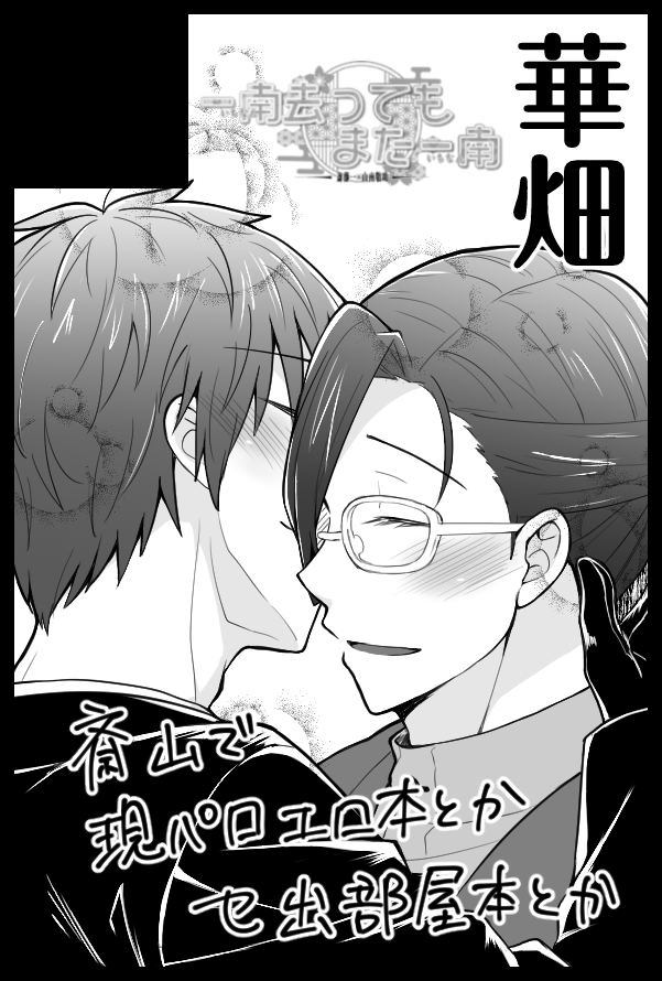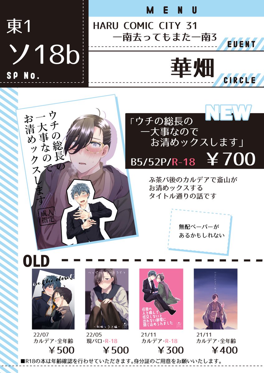 3/19春コミのお品書きです、斎山プチオンリー「一南去ってもまた一南3」に参加してます新刊はお清めックス本です(サンプル→ pixiv.net/artworks/10624…)東1ホール・ソ18b「華畑」ですよろしくお願いします