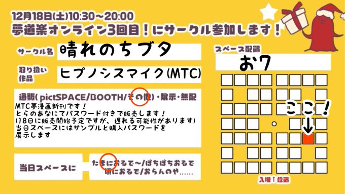 【告知】 12月18日(土)に夢道楽オンラインに参加します! 先程のhpmi夢新刊をとらのあなでパスワード付きで販売する予定です。 私の方で通販開始が確認できましたらTwitterでお知らせさせて頂きます。 よろしくお願いします! 新刊サンプル→ twitter.com/buta_05/status… #夢道楽オンライン3回目
