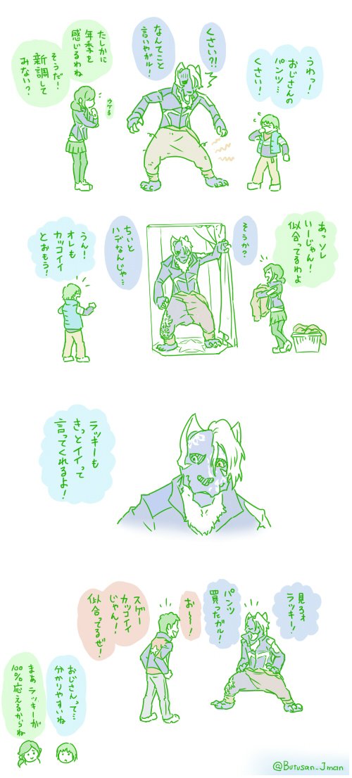20 77 #みなさん去年の今頃はどんな絵描いてましたか 小太郎くんが入った頃くらいですね あとガルさんのパンツ変わってた頃(目敏い)なので3人でお買い物してるといいな漫画描いてた 18/04/21 22:27