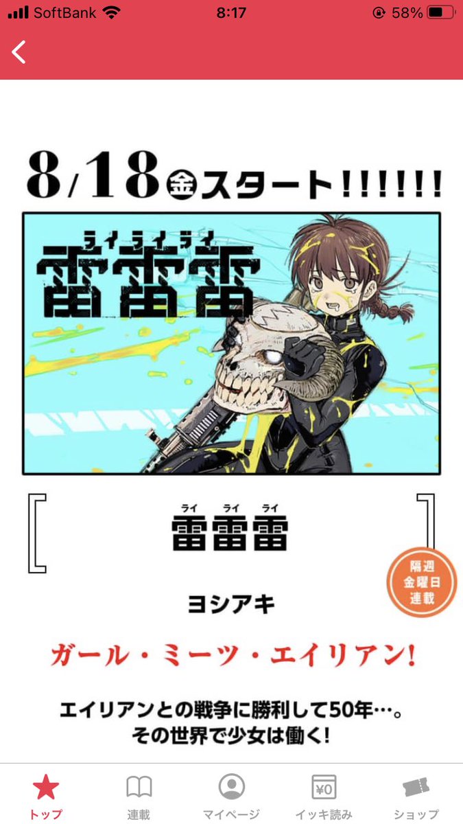 マンガワンにて、『雷雷雷』の連載が開始しました。訳の分からんタイトルですが、よろしくお願いします! あと、前作のBBAが無料で読めます。 新しいおまけ漫画も更新してるよ!