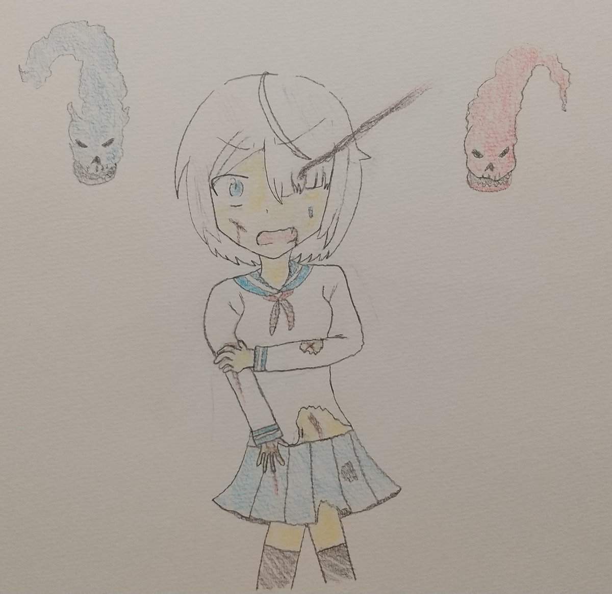#西念幽子 #ベイブレードバースト 落書き感覚で描いたけど流血表現があるのと、雑すぎたからボツにする予定の絵。 魔改造ベイ達と正面から戦ったら、リアルバースト寸前の状態になったてちさんち(@Tiziano_Craft)の西念幽子。