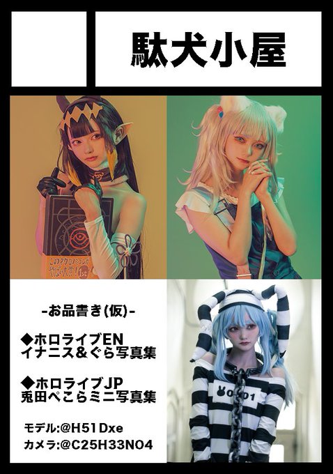 あなたのサークル「駄犬小屋」は、コミックマーケット101で「土曜日東地区 "ク " 15a」に配置されました!webcatalog.circle.ms/Circle/Map/168… #C101WebCatalog 新刊でイナニスとぐらの写真集とぺこーら囚人服のミニ写真集2冊と既刊1冊用意しようと思ってます!よろしくお願いします!