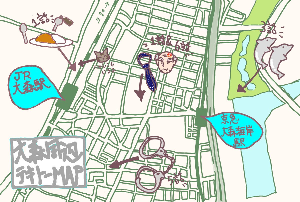 しながわ水族館🐬🐬に行きたい人が結構いらっしゃったので、周辺ロケ地のおおよそ位置関係MAP描いたよ JR大森駅と京急大森海岸駅の間は徒歩10分くらいなので🦍じゃなくても歩けます。わりとテキトーなので行くときはちゃんとした地図見て行ってね🫡 twitter.com/C75614930/stat…