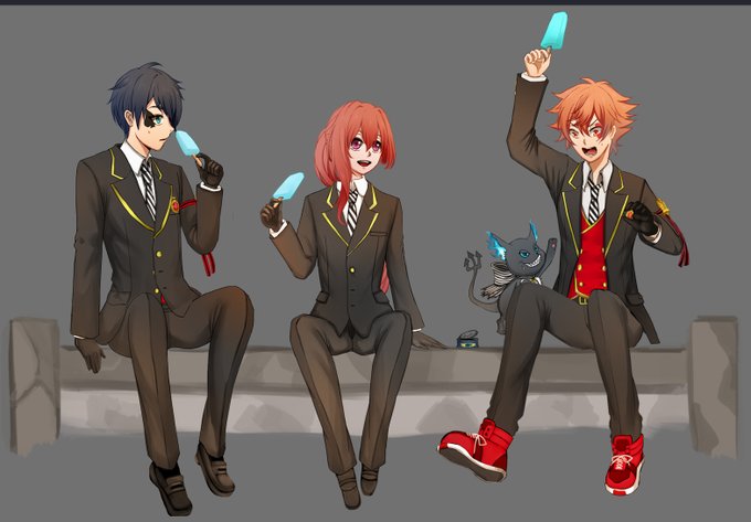 3人と一緒にシーソルトアイスを食べる 1匹はツナ缶 *監督生♀️男装注意*顔出し注意* *ちょっとしたキングダム ハーツ(KH)パロ* #twst絵描きさんと繋がりたい #ツイステ絵描きさんと繋がりたい #twstプラス #ツイステファンアート