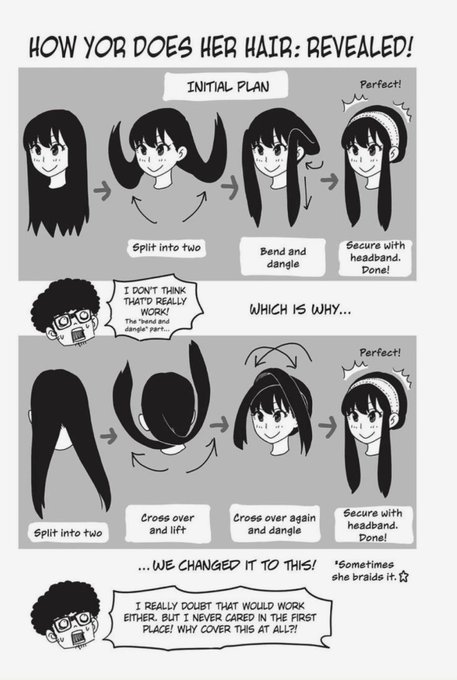 I've been trying to figure out how Yor's hair is styled, for my animation; it turns out that the author has implicitly admitted to it being a confusing style, haha.