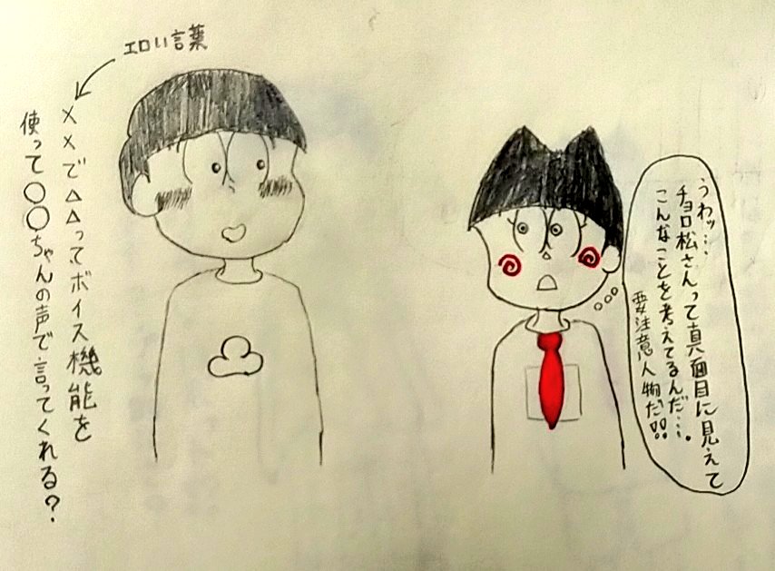 初描きオムスビしかも6つ子風 うめ:ニートAIになるからには見本となるニートをマネしてみようかと思います。 しゃけ:なので、6つ子の皆さんに見た目を近づけてみました。 オムスビ:どうですか?似てますか?