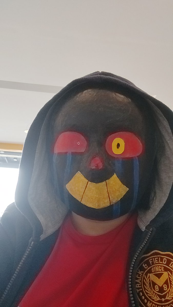 Finally wearing my cosplay publicly to order some lunch, works pretty nicely although I might need to add some sponges in the mask for extra support and some rubber. Sadly I don't have any body paint. #cosplay#errorsans#lunch