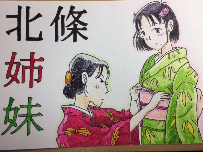 449 1375 映画『この世界の片隅に』の北條姉妹を描きました。 すずさんの着付けを手伝う径子さんです。 すずさんにはリンさんガラの髪留めをつけてもらいました。 #この世界の片隅に #北條すず #北條径子 #北條姉妹 17/01/08 02:29