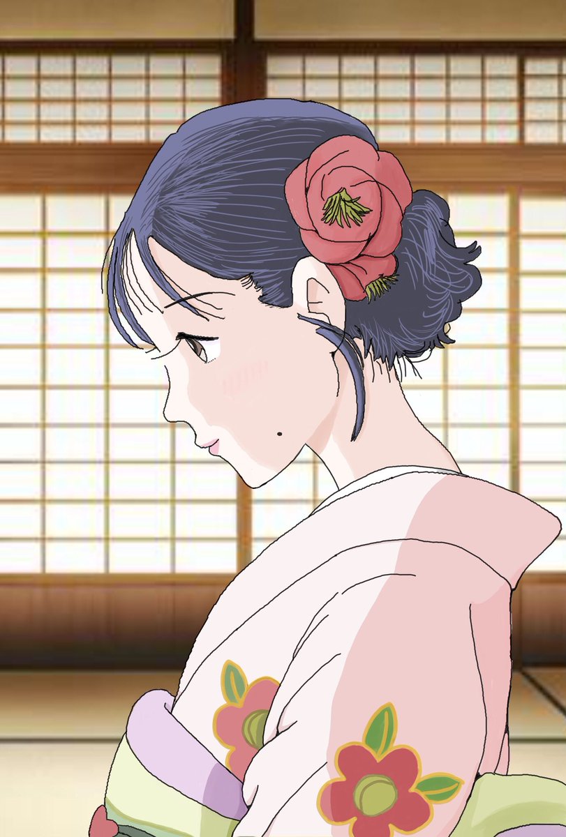 映画『この世界の片隅に』の北條姉妹を描きました。 すずさんの着付けを手伝う径子さんです。 すずさんにはリンさんガラの髪留めをつけてもらいました。 #この世界の片隅に #北條すず #北條径子 #北條姉妹