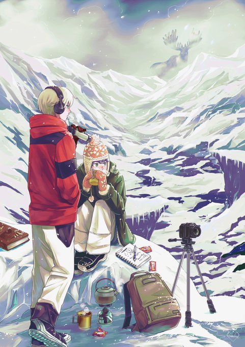 3 10 【氷の国】 冷たく厳しく美しい、氷の王の君臨する大地 「何か見えた?」 「いない。条件は揃ってるハズなんだけどなぁ」 「あ、向こうの方何か動いたよ!」 #イラスト #創作男子 #氷山 #アウトドア 22/11/18 12:24