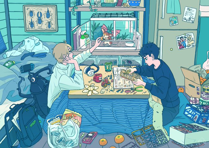 【試験前夜24時】 頑張る前に必要なのは、ほんの少しの気分転換! 「0時だ」 「まずいねぇ」 「…そろそろやる?」 「まだいいよ」 #イラスト #創作男子 #雨 #猫 #ゲーム