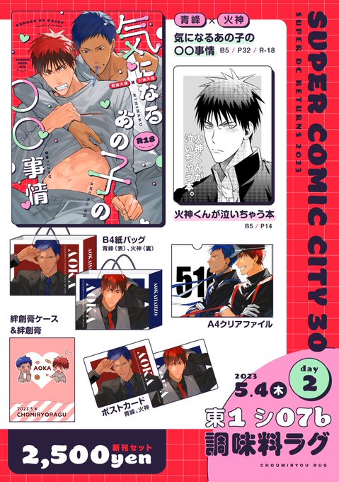 『5/4DCRお品書き🏀』 シ07bにてお待ちしております🙏💙❤️ 青火新刊セット2500円 ◾️気になるあの子の〜新刊 【pixiv.net/artworks/10752…】 ◾️🔥くんが泣いちゃう本 【pixiv.net/artworks/10749…】 ※友人さんにゲスト来ていただいてます!