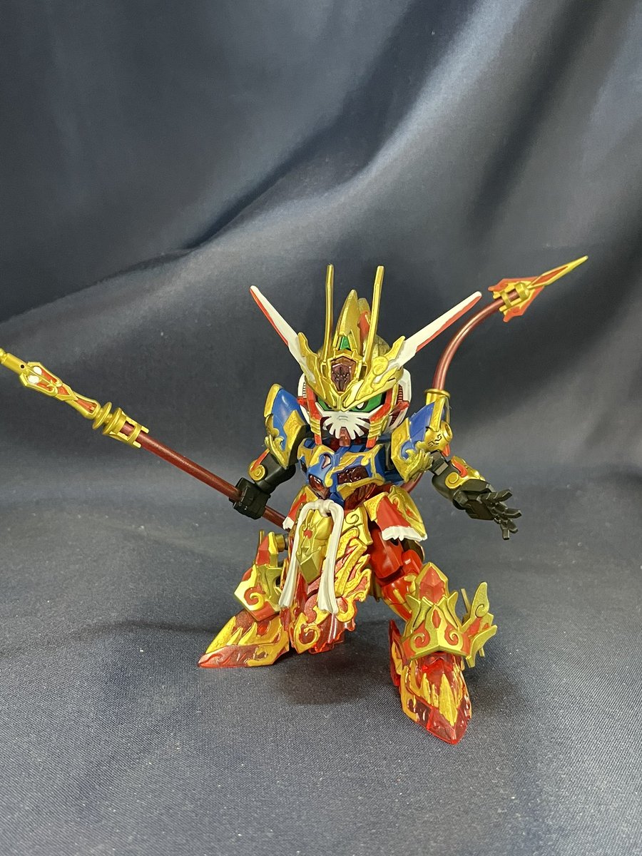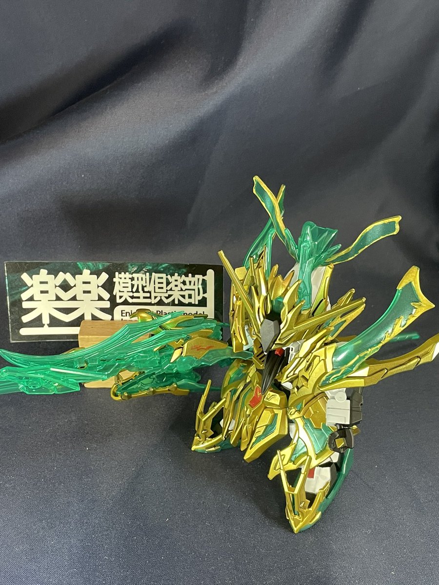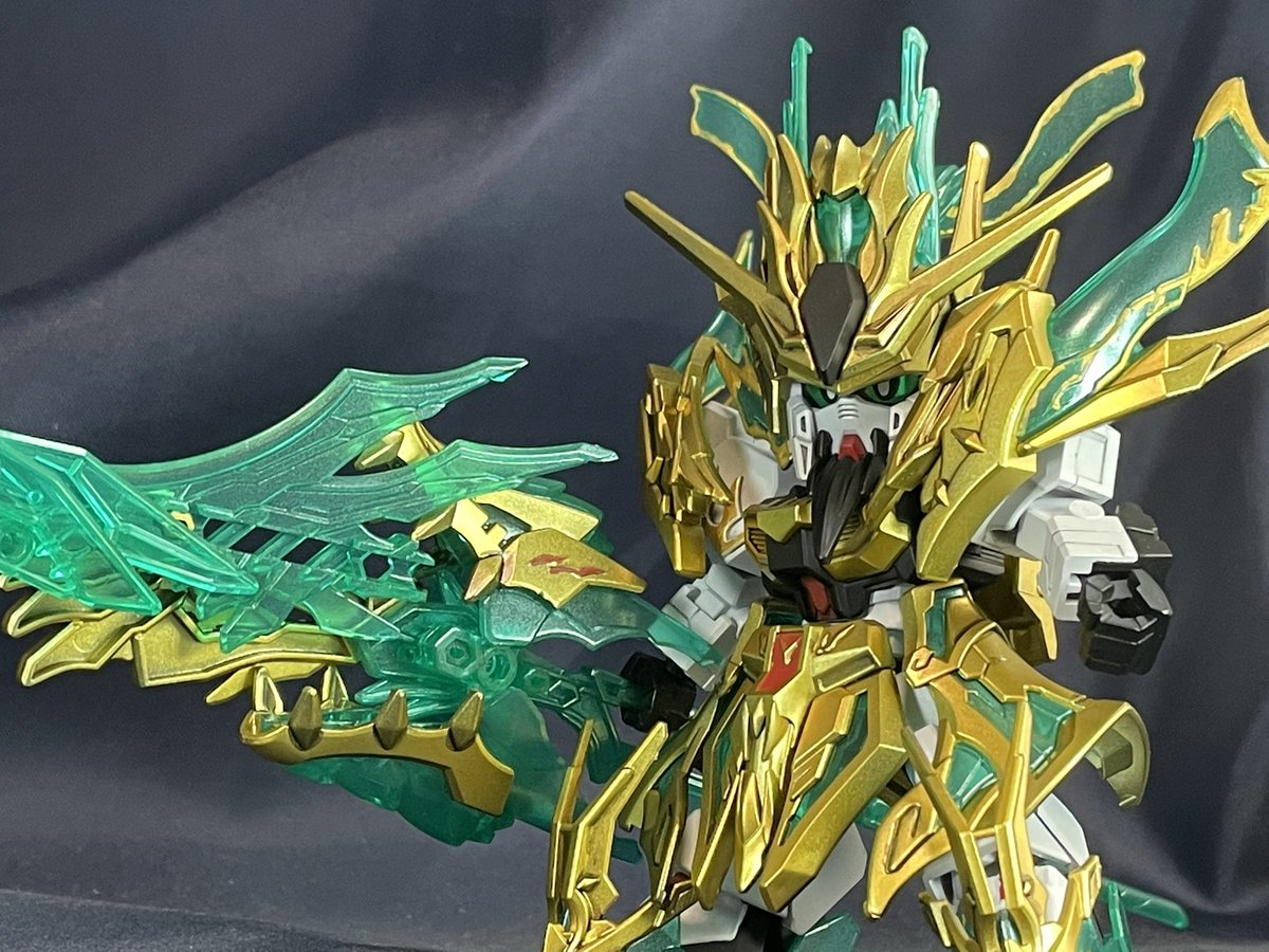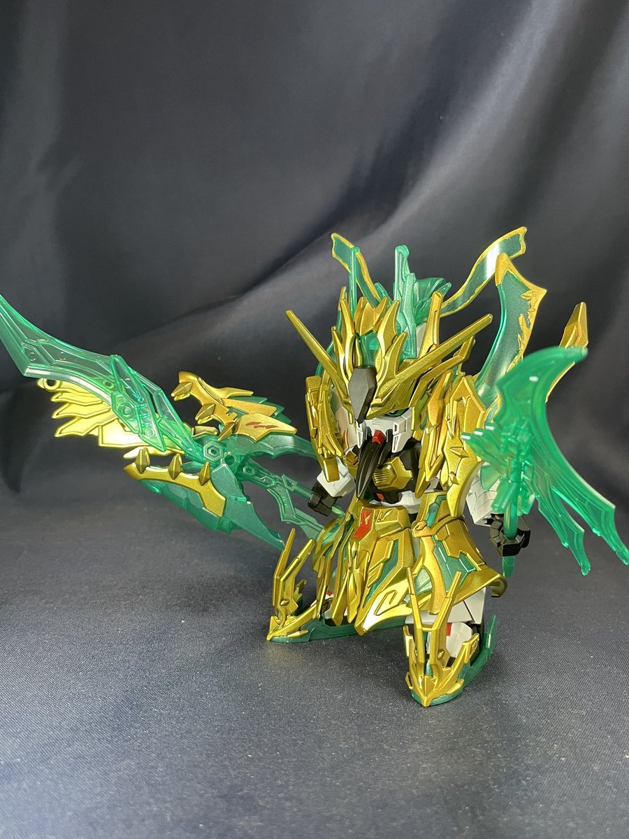 #三国創傑伝 の武聖関羽雲長νガンダム完成しました。 とにかく槍がカッコイイ! クリアパーツの縁取りをしただけでも大分見栄えは良くなったかな。 #ガンプラの画像貼るとRTされると聞いて #ガンプラ好きと繋がりたい #楽楽模型倶楽部