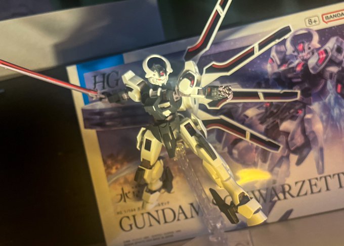 久しぶりにガンプラ組みました HGシュバルゼッテ これは豆知識ですが、オタクがライブで振る光る棒を使うと机の上が簡易撮影ブースに早変わり✨✨ 推しのフィギュアを盛りたいときにも使えるのでオススメです🤗 #ガンプラの画像貼るとRTされると聞いて #水星の魔女