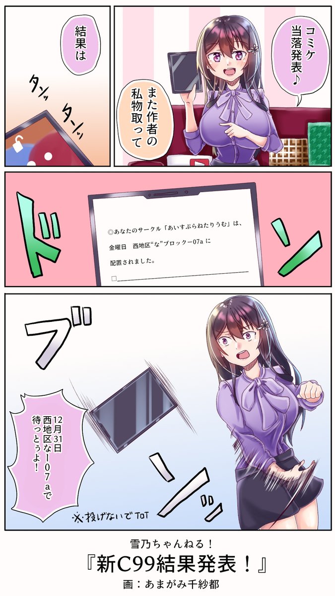 ◎あなたのサークル「あいすぷらねたりうむ」は、金曜日 西地区“な”ブロック-07a に配置されました。 当選いたしました、ありがとうございます。目指せ11月末脱稿! webcatalog-free.circle.ms/Circle/15708863 #C99WebCatalog #C99当落