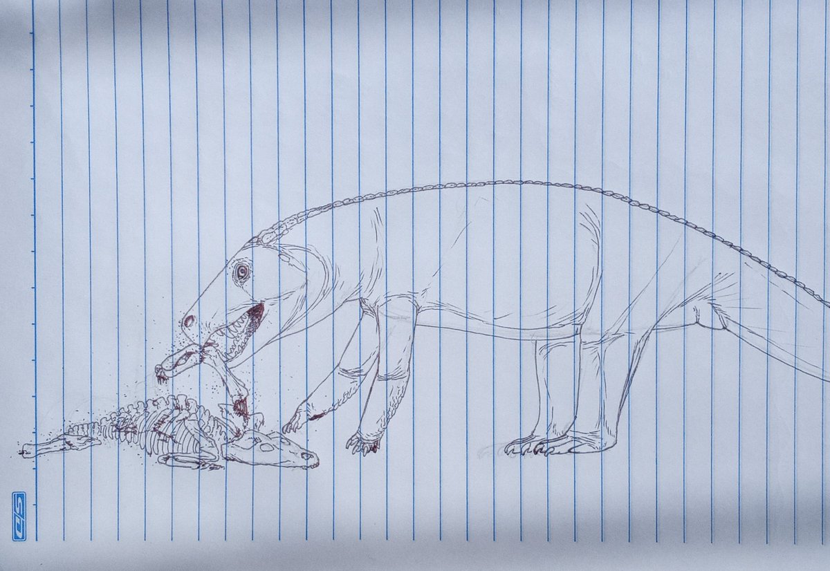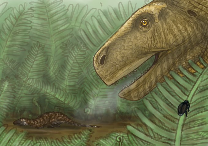 Esse Rauisuchus tiradentes encontrou algo no chão, ele não consegue saber ao certo, mas não está tão convencido de que se trata de uma folha seca... . Feito durante uma chamada no server do @_themingau No discord! . #paleoart #paleontology #triassic