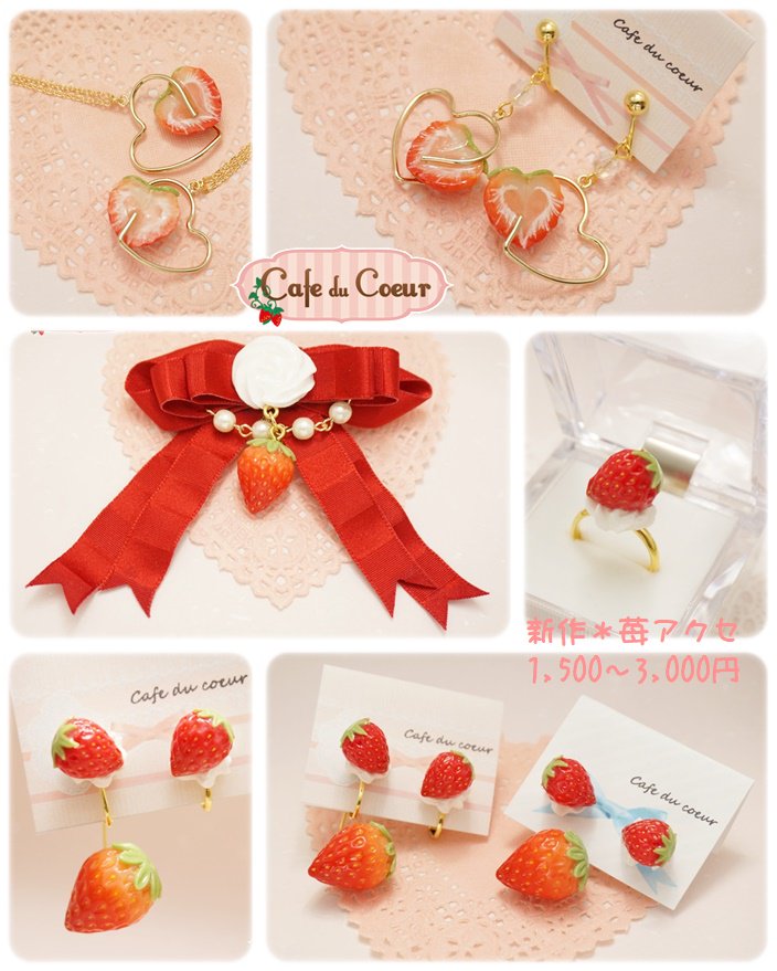 #デザフェスお品書き 一枚目は苺アクセサリー新作たち。 二枚目も前回のデザフェスではなかった作品ですので準新作になります! 三枚目は林檎(一部苺)アップルパイは秋冬の人気作品です🍎 #デザフェス #すいーふぁ