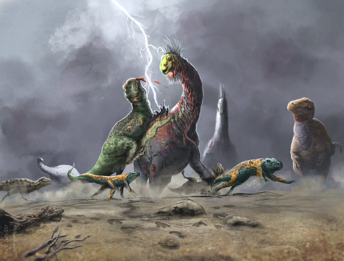A battle between oviraptors, where the other decides to rip some of their rival's protective soft tissue. #Oviraptor #Cretaceous #Paleontology #Digitalart #Dinosaurs