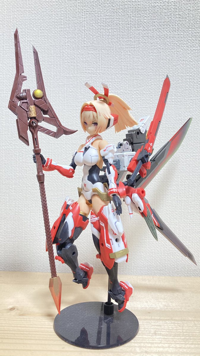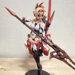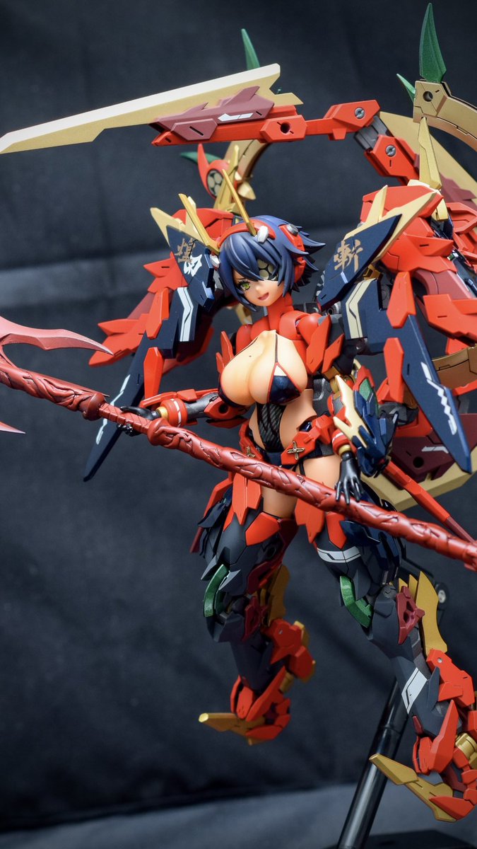 「皇巫 スサノヲ-焔槍-」 完成しましたー!!いろいろ初めての事も挑戦しつつ出来たのでちょっとだけ経験値もあがった気がしてます。 とりあえず存在感がすごい笑 #メガミデバイス #スサノヲ