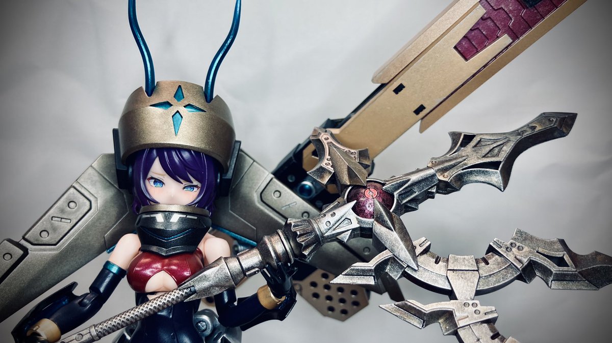 余剰パーツやらなんやらから生まれた 「朱羅 玉藻ノ前 蒼鬼」完成しました。 大型武器はメガミの嗜みや! 姉との合わせも良きです #メガミデバイス