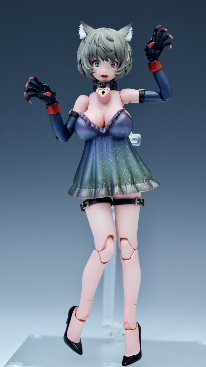 113 416 夜の街をふわりと歩く化け猫、完成しました!めっちゃかわいいい!!(自画自賛 肌の塗りは吉村晃範さん、ドレスはコジマ大隊長さんの雑誌作例を参考に塗装しました!! 使用キットはリプに続くんじゃ! #メガミデバイス 23/06/24 22:57