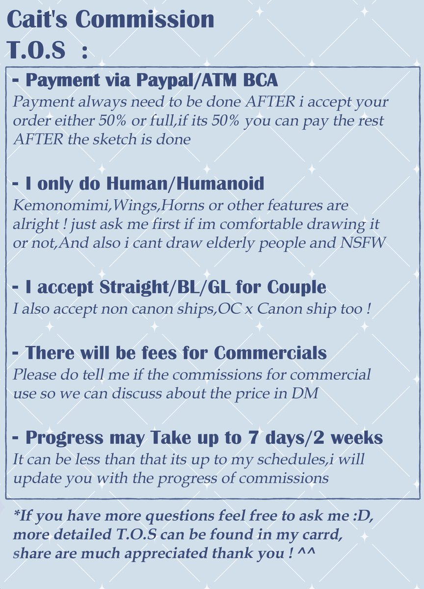 C0MMISSI0N OPEN 💕^^ More infos about the commission can be found in here : caitsithola.carrd.co Any help Like & RT will be very appreciated,Thank you so much💕 Feel free to dm me for more infos >3<💞 #commissionsopen #commissions