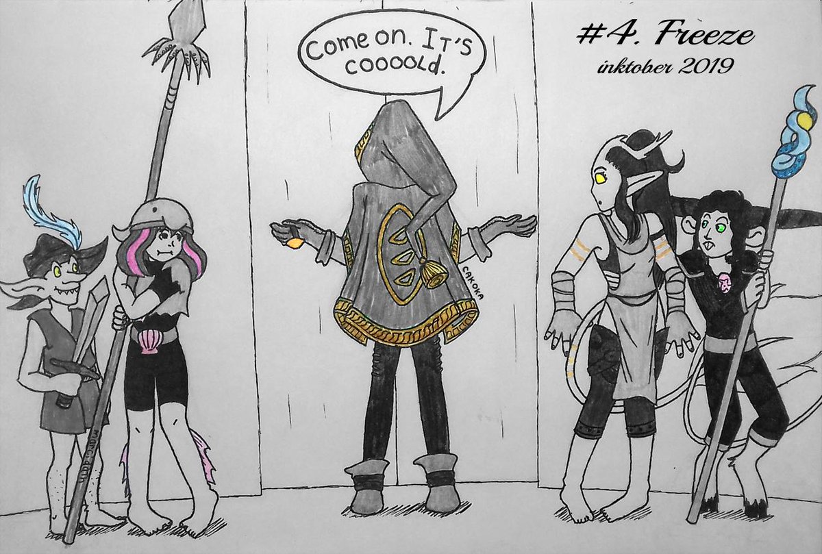 #Inktober2019 day 4: Freeze The door was open with nobody inside. We stood there for two minutes. From left to right: Npc Droop @WhiteThird my own char Flowan - Baker @Htg17_arts - Amethelia @Cellebellers - Falazar @dravatti #DnD #dnd5e #Inktober #dungeonsanddragons