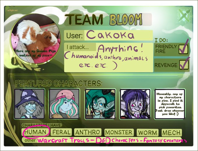 Participating in #Artfight again! artfight.net/~Cakoka I'll do my best to make some nice drawings for people :) #artfight2022 #artfightteambloom #TeamBloom