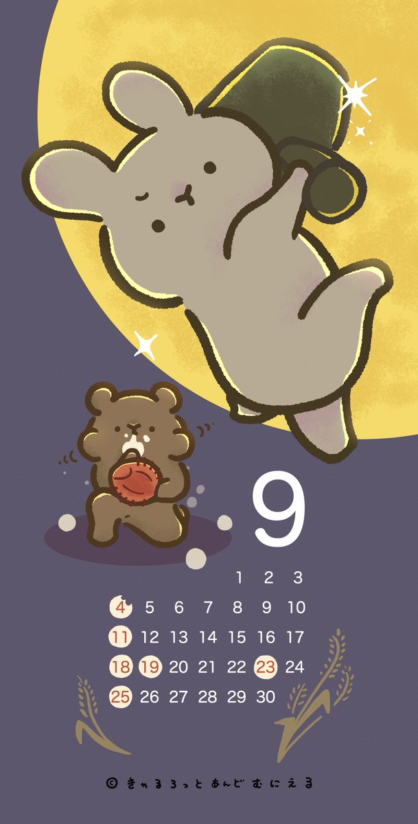 【🎑9月のカレンダー🎑】 白玉本塁打競走(ホームランダービー)!! むにえる大歓喜の食べ放題イベントです笑笑 満月のデザインで2パターン作りました✨ 9月もゆるく乗り越えましょう✊ #きゃるろっとあんどむにえる #きゃるむに #カレンダー #9月カレンダー #絵描きさんとつながりたい