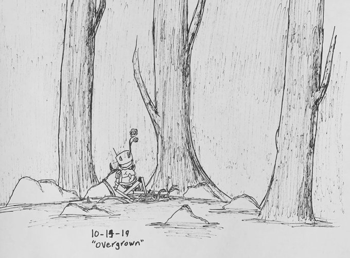 Day 14~ theme was overgrown so I drew a robot in a forest, also messed up the day when I first wrote it #inktober #inktober2019 #Inktoberday14