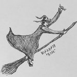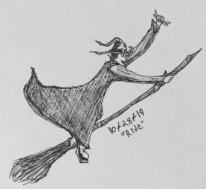 Day 28 is “ride” so I drew a wizard riding a broom and holding up some sort of snitch, been listening to Harry Potter audio books recently so got the idea from there #inktober #inktober2019 #inktoberday28
