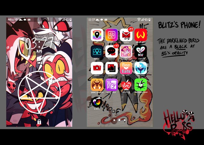 Continuing on my contribution for EP7, I got to make a lock screen and wallpaper for Blitz's phone as well as design the apps!! Big thanks to @JaneGumball for helping me find such a cute idea for the wallpaper!! #HelluvaBoss