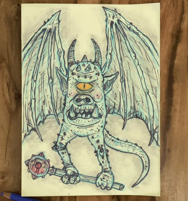 Here's a silly one. WINGED Fiend with a mace for boppin heads for #mabsdrawlloweenclub #inktober2020 🦇🦇🦇