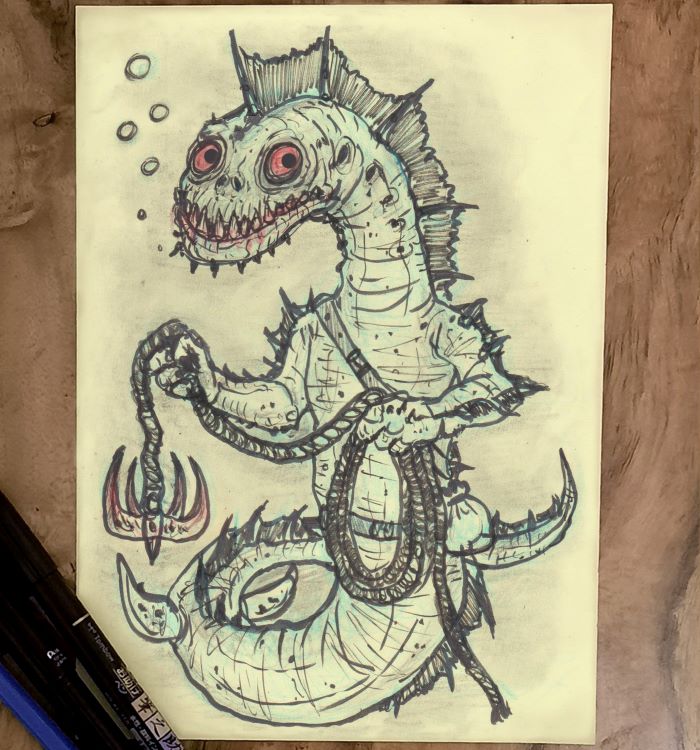 SEA MONSTER with a grapple hook for grabbing poor unsuspecting sailors. 🌊🎣 for monsterdrawingclub #drawlloween2020 #inktober2020