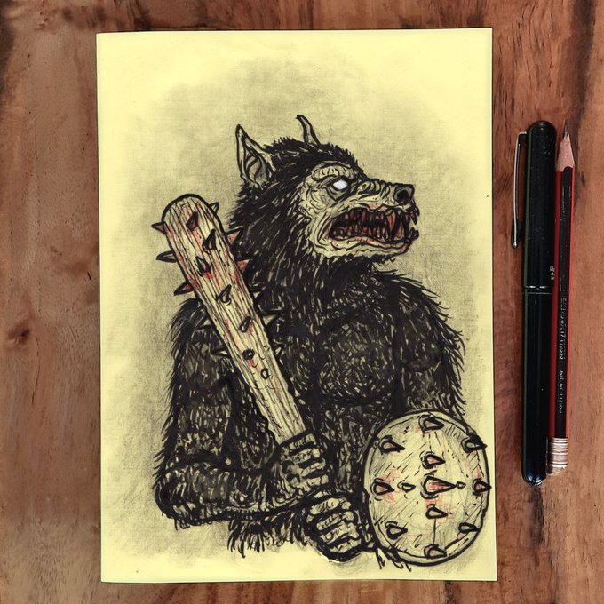 Werewolf for #mabsdrawlloweenclub2021 Based it on this manuscript piece. Getting clubbed AND mauled to death. Eeeek. #inktober2021