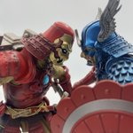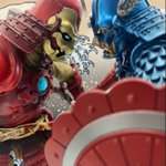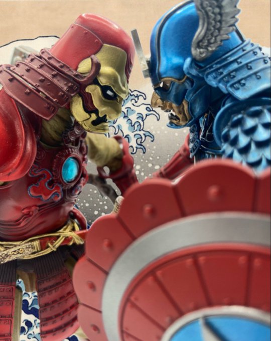 『そこびあ騒動』 その昔"そこびあのお触れ”を巡って起きた同士討ち。何かと持ってない冬将軍に仇討ちを仕掛けた鋼鉄武人四十六とそれを庇った大将亜米利加の殴り合いの図。 #フィギュア撮影友の会 #marvel #シビルウォー